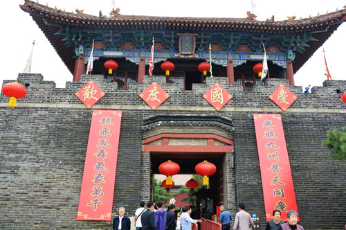 为营造欢乐祥和的节日氛围,在正阳门及厚载门外悬挂“欢度国庆”标语口号和对联,南北城墙上悬挂龙旗、灯笼。