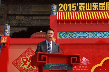 5月3日上午,2015'泰山东岳庙会暨台湾信众泰山行、韩国民俗文化交流周启会仪式在岱庙天贶殿大露台隆重举行。泰安市委常委、副市长周桂萍,泰山景区党工委书记谭业刚,泰安市政府办公室副主任葛宝文,市直相关部门负责人出席活动仪式;中国民俗学会副会长兼秘书长、中国社会科学院世界宗教研究所研究员、博士生导师叶涛,国际亚细亚民俗学会韩国会长金京南,韩国文化财厅、韩国传统文化大学教育学院院长柳春圭,台湾善化东岳殿主委尤耿村,台湾信众参访团、韩国民俗文化交流团、淄博博山区大桥村香社团、泰安梆子剧团等应邀嘉宾,以及中央、省市各级媒体记者参加启会仪式相关活动。