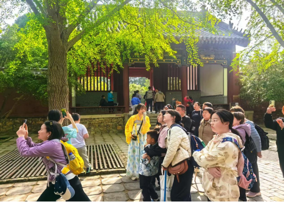 清明节期间,岱庙讲解员身着汉服开展讲解服务,成为春日岱庙一道独具韵味的风景线。宽袍广袖随风摇曳,典雅形制尽显东方气韵,讲解员们以温润之声、专业之识,娓娓道来岱庙的千年故事、古建筑的营造智慧与清明习俗的文化底蕴。这种沉浸式文化表达,既活化了传统文化的传承方式,丰富了游客的游览体验,更为传统文化与当代生活的深度融合注入了鲜活活力。