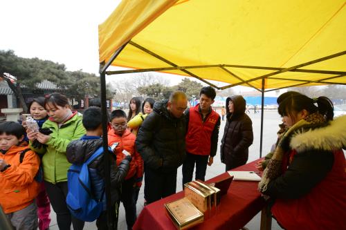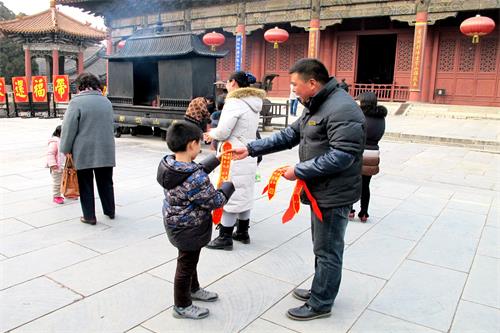 在天贶殿,向游人免费赠送平安带,把平安祝福带回家活动。