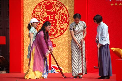 此外,启会仪式现场中外艺术家还依次表演琵琶演奏、韩国尚帽舞、台湾民间艺术八爷戏狮、捶丸秀、燕青打擂等精彩节目,赢得了游客阵阵喝彩。今日启会恰逢“泰山老奶奶”碧霞元君寿辰,岱庙汇集了不少香客。仪式结束后,泰山神、泰山老奶奶、福官等走出大门,为百姓送福。在本届庙会期间,还增加了香道、茶道雅集,泰山公益大讲堂等参与互动文化体验项目。