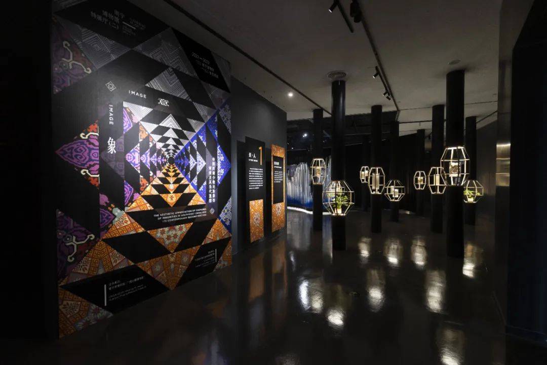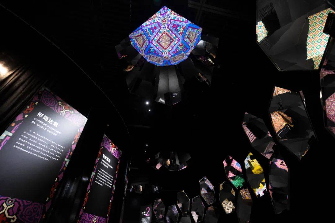 展陈设计独具匠心。展览主视觉的设计来源于万花筒的图形构成创意,用万花筒对称排列成新的视觉图案,交织出西南少数民族服饰追求意象美的生活美学。展览主视觉上的四个图案,是展览四个部分的代表性图案的变形。展览空间采用了艺术装置与陈列并行的方式,将场景、设计、文字、展品融为一体,将少数民族生活的环境、节日的场景、服饰的色彩与纹饰一一解构重塑,融入到展厅的艺术装置当中来阐释人与自然和谐共生的关系,从多种全新的视觉角度向观众呈现民族服饰之美。