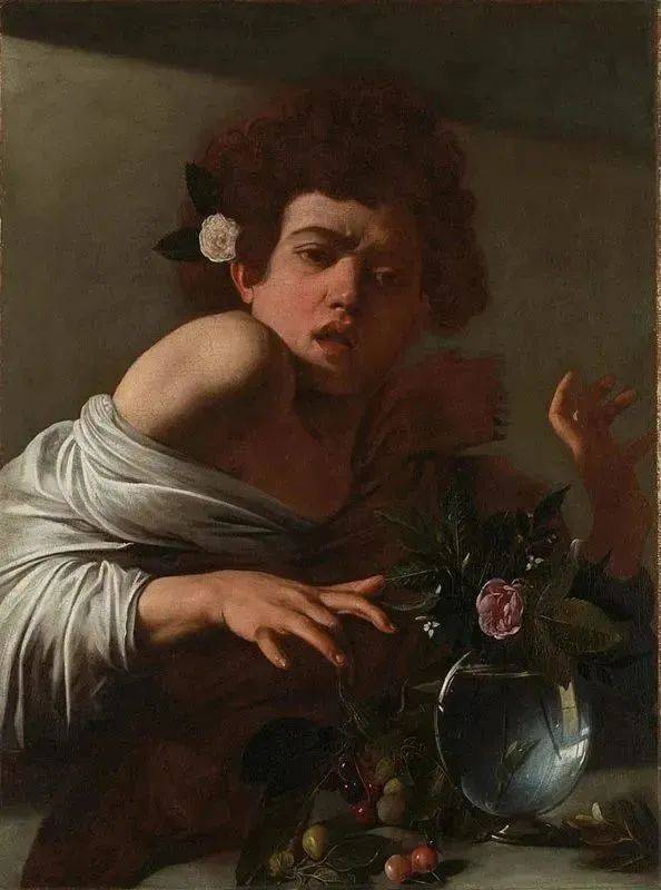 在这件作品中,一位皮肤白皙,年轻秀气的卷发少年刚被蜥蜴咬了一口,神情痛苦,在惊讶中向后退缩。纵观卡拉瓦乔1592年至1600年间的作品,出现了许多相似的脸孔,他是卡拉瓦乔早期作品里的模特马里奥·明尼蒂。他现身于《捧水果篮的男孩》(附图见微信导览)《占卜者》《酒神巴库斯》《鲁特琴演奏者》《圣马太蒙召》等诸多传世名作中。然而1600年之后,却再也不见他的身影,由此人们对卡拉瓦乔钟爱的模特也产生了无限的遐想。