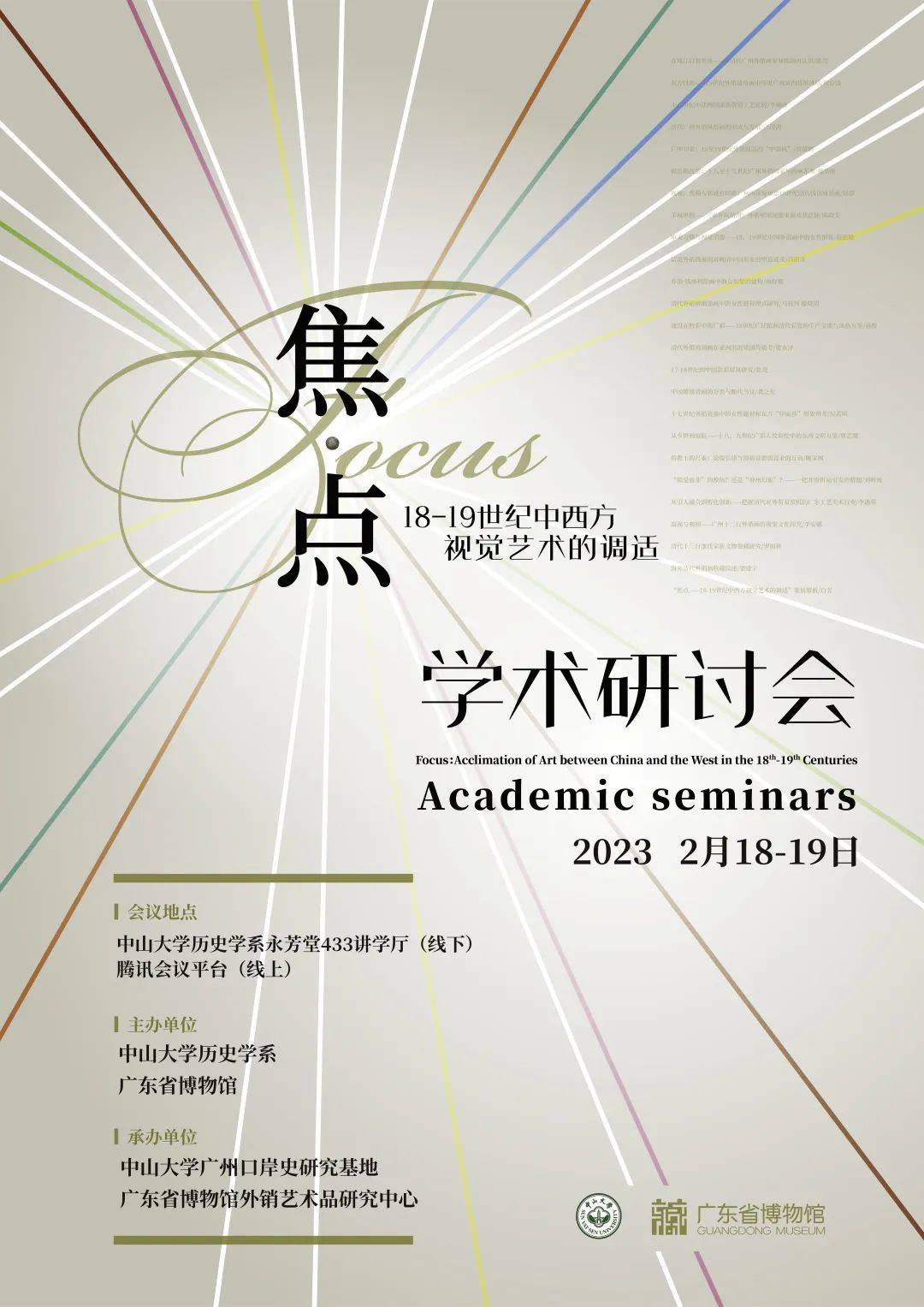 为推进对这一段中西艺术交流史的学术研究,由中山大学历史学系、广东省博物馆(广州鲁迅纪念馆)共同主办,中山大学广州口岸史研究基地、广东省博物馆外销艺术品研究中心联合承办的“焦点:18-19世纪中西方视觉艺术的调适”学术研讨会,将于2023年2月18-19日在中山大学历史学系永芳堂举办。