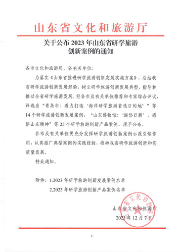 近日,山东省文化和旅游厅印发《关于公布2023年山东省研学旅游创新案例的通知》,潍坊市博物馆申报的《潍坊市博物馆孔子学堂:“考工坊”,研学新路径》案例成功入选2023年山东省研学旅游创新产品案例。这是市博物馆为深度推动馆校教育共建研学游,利用好博物馆文物资源,发挥博物馆公共教育优势的一次创新实践。