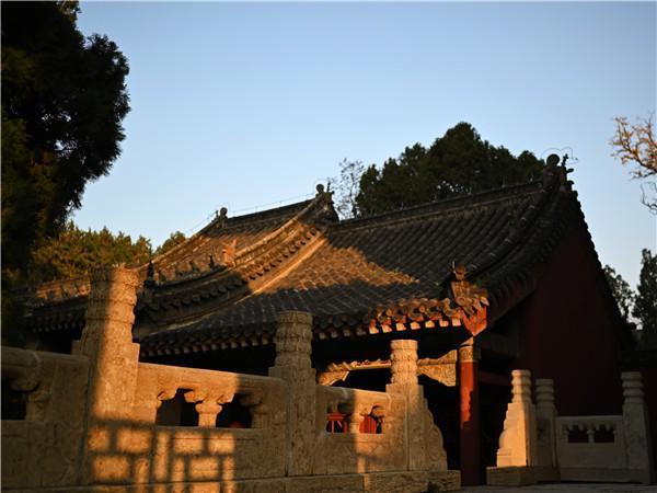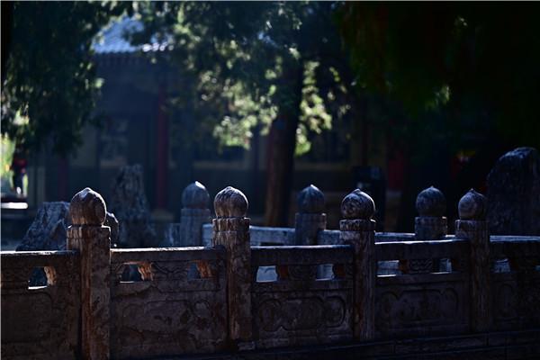 庙宇低诉、远山如诗、青砖静默,阳光透过树叶洒落岱庙,光与影的交锋下,打造了空灵典雅如画 的色调,红墙灰瓦的古建筑周围,更添平静的威严感,千年古庙的古朴与深邃愈发明显。