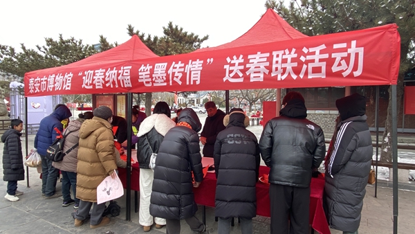 2月2日上午,博物馆在岱庙北门外举行了“迎春纳福 笔墨传情”送春联活动,在大红的对联和福字的点缀下,热闹的场景和游客市民欢快的笑颜,为即将到来的春节增添了浓厚的喜庆氛围。