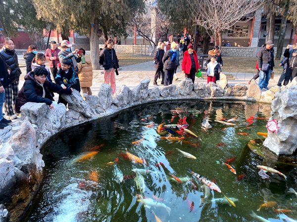 锦鲤自古就被赋予富贵吉祥、健康长寿、幸运繁荣的美好寓意。春节期间,岱庙西花园、仁安门、唐槐院、汉柏院的六处鱼池吸引了众多游客驻足。五彩锦鲤仪态优雅,在水中结队畅游,给游客以赏心悦目的感官享受,去岱庙“赏锦鲤”成为春节岱庙游客的必选项目。