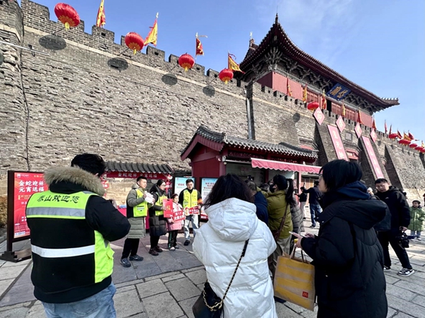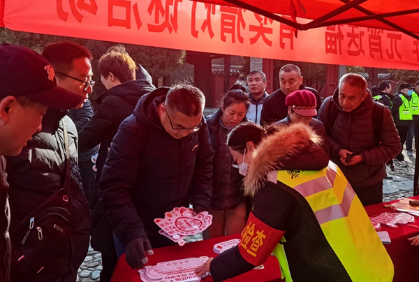 “游岱庙福地,打卡集福气”活动同样吸引游客纷纷参与。他们满怀热情,穿梭于岱庙的各个角落,兴致勃勃地寻找打卡点,认真收集“健康福、学业福、事业福、财运福、家庭福”五福印章,而参观了天贶殿壁画的游客更是收获额外惊喜,成功领取“好运福”印章。集齐六福的游客满心欢喜地领取精美礼品,尽情感受着满满的福气。游客激动地表示,这样的活动不仅为游览增添了许多乐趣,更让优秀传统文化以生动鲜活的方式得到传承与发扬。