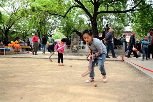 唐槐院内,捶丸、投壶、击铜钱等传统竞技项目区内传来孩子们阵阵欢呼雀跃的声音。通过这些竞技运动,让孩子们在愉悦的活动中了解并传承我们中华民族自己的文化。