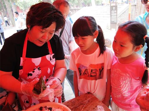 在阁老池东侧,“你做•我学•包粽子”活动深受孩子们的喜爱,外国游客也被现场的热情吸引,加入到包粽子的行列,一招一式学的极其认真。大家都从中感受到了浓郁的节俗氛围。