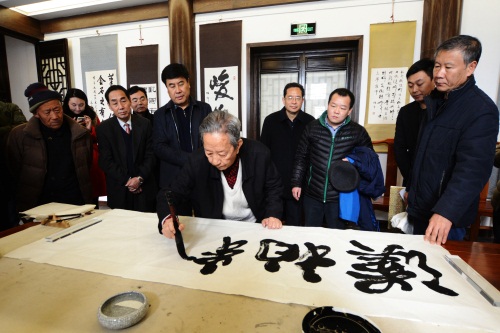 随后,泰山景区管委会主任姚霆和杨辛先生共同为艺术馆揭匾。在参观现场,杨辛先生铺开宣纸,现场挥毫,写就一幅“汉柏精神”,一并收藏在艺术馆内。