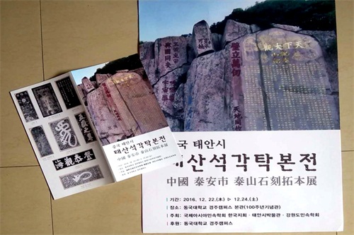 2016年12月21日至25日,应韩国国际亚细亚民俗学会江原道民俗学会之邀,泰安市博物馆组织的“泰山石刻拓片展”在庆州东国大学成功举办。此次展览共选取泰山石刻精品拓片23幅,包括真、草、隶、篆各种书体,展览受到了韩国众多书画艺术家的喜爱,特别是《汉张迁碑》、《汉衡方碑》拓片,艺术家们表示:这些以往只能在书本上看到的作品,今天得见真品,感到异常的兴奋。