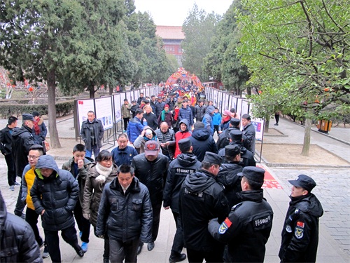 今年岱庙继续实行大年初一初二免费开放的惯例。为做好春节期间各项工作,博物馆提前制定了安全预案,并与公安、消防部门配合,明确分工,精心组织。人流高峰期间,增开东、西掖门及时进行疏导。在重要烧香点增派人手,增加护栏。虽然客流量比较大,但是秩序井然。通过全体员工的共同努力,为广大市民游客创造一个安全、文明、舒适的节日游览环境。