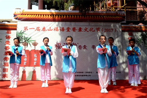 岱庙厚载门外的小广场上,第一届“中国梦泰山迎端午·福语堂香囊祝平安“2017泰山端午民俗汇暨泰山福语堂香囊文化节在一阵欢快热闹的舞狮表演中正式启动。本次活动邀请了著名主持人”小么哥”来到现场,与游客和市民进行了现场互动,向他们赠送香囊、合影留念,共同欢度我国传统节日。活动中,主办方特地为“泰山三工”(清洁工、环卫工、挑山工)代表赠送了香囊和节日慰问品,部分小学生身着传统古装共同朗诵了《孝经》,感恩父母的养育之恩。此外,“旗袍香囊秀”活动也吸引了不少游客市民观看,让大家大饱眼福。