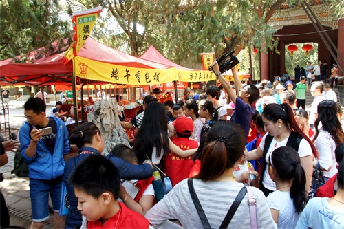 在仁安门区域,特色端午市也热热闹闹的进行着,泰山香包铺、五毒饼铺、泰山女儿茶铺、肥城桃木等十几家端午特色习俗店铺汇集在这里,让游客和市民感受到浓浓的端午味道。