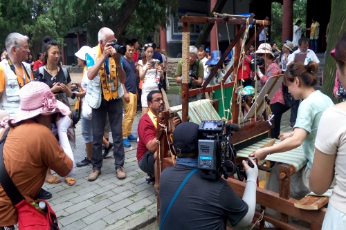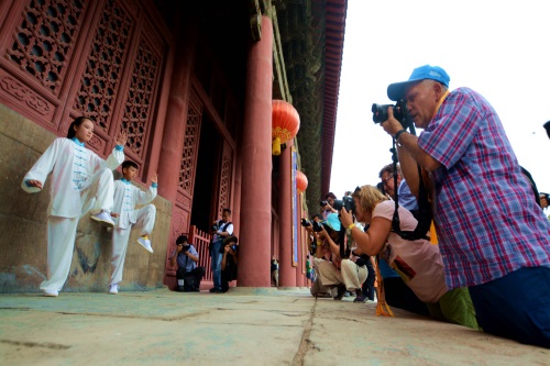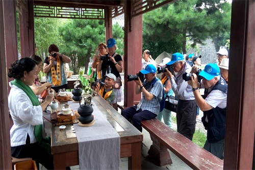 千年古庙深厚的文化底蕴引起了嘉宾们的浓厚兴趣。摄影师们分为三组,对摄影书画展示及非遗文化展演、泰山特色沙画表演、泰山禅茶表演进行了拍摄,并共同考察拍摄了东岳太极表演、泰山皮影表演、皮影制作、泰山泥塑以及泰山石敢当文化等非遗文化展演。博大精深的中国传统文化、磅礴厚重的平安泰山文化,让摄影师们赞叹不已,用手中的相机不停地拍着,用最美的镜头记录下这美好的一切。
