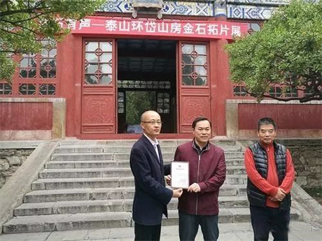 10月25日上午,泰山环岱山房金石拓片捐赠活动在岱庙配天门举行。活动现场,泰安收藏家李德成先生将自己多年收藏的原始精品拓片12件,无偿捐献给泰安市博物馆。博物馆向李德成先生颁发了捐赠证书,中央美术学院中国画学院教授著名画家岳黔山先生现场为市民和游客解读了金石拓片展品。