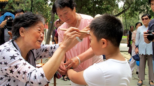 来自泰安小记者团的孩子们正在接受年长者点雄黄驱邪、系五彩绳保平安的美好祝福。