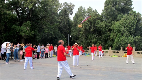 天贶殿的大露台,空竹表演者精彩的技艺让大家感受空竹龙飞凤舞之韵美。