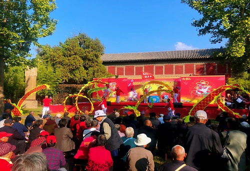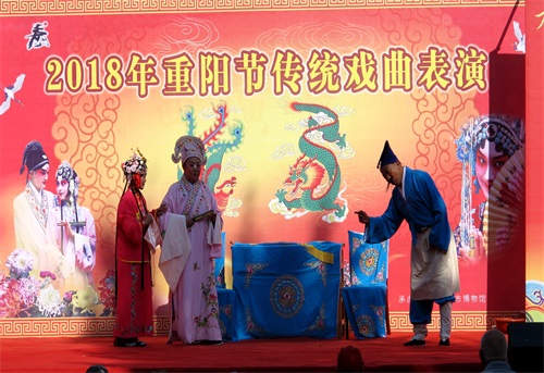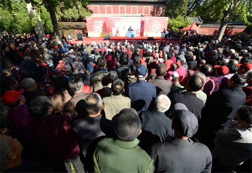 在岱庙内,最热闹最具有人气的地方当属西南角的唐槐院,一年一度的“重阳节传统戏曲表演”在一阵热闹喜庆的舞龙表演中拉开了帷幕。一大早来自四面八方的老人们就聚集到了这里,只为了看到他们最喜爱的传统戏曲表演。本次活动岱庙安排了多项丰富多彩、符合群众文化需求的山东吕剧、传统戏曲和地方优秀戏曲表演,其中传统剧目《墙头记》,不仅以戏曲艺术表演的形式来弘扬中华民族传统美德,培育尊老敬老风气,还通过活动方式来推动吕剧这个非物质文化遗产的传承发扬,对于今天和谐社会的建设有着积极意义和深刻影响,演员们的精彩表演赢得现场观众的阵阵掌声。
