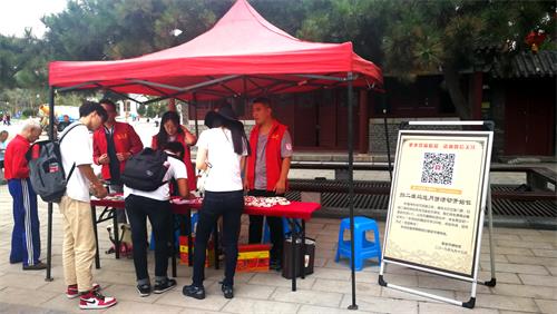 北门广场上,来自各院校的志愿者们热情的指导游客进行手机扫二维码领月饼活动,让不能在家过节的朋友们也能感受到传统节日的味道。
