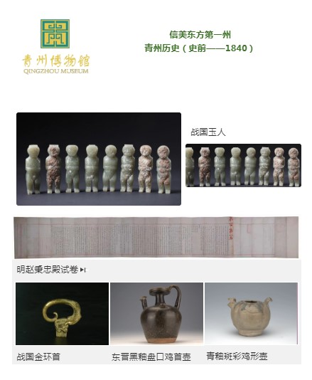 青州市博物馆 信美东方第一州青州历史(史前——1840)通过展出不同时期青州境内出土、传世的馆藏精品文物,尤其是近年来新出土的精品文物,展示青州悠久的历史,璀璨的文明。整个陈列按照时间先后顺序划分为九个部分:史前时期、商、周、秦汉、魏晋南北朝、隋唐、宋金元、明清。各部分根据展示需求,分为几个单元。力争把最新的青州历史的研究成果展示出来,突出青州在山东乃至中国历史上的地位,最大限度的满足公众的参观需求。