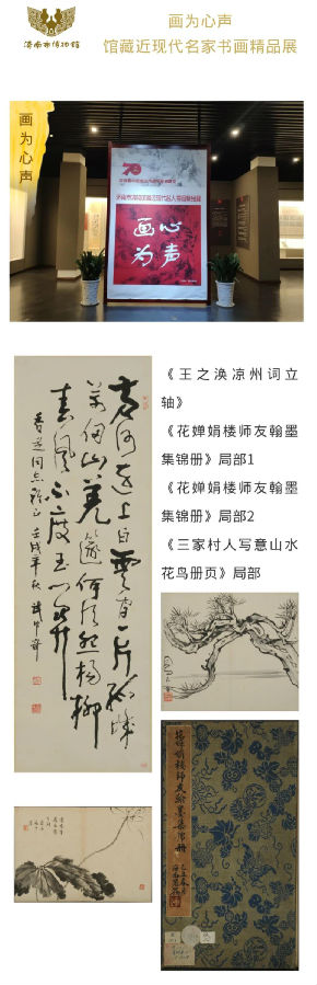 济南市博物馆 《画为心声——济南市博物馆藏近现代名家书画精品展》,是庆祝新中国成立70周年系列展览之一,展览遴选了吴昌硕、张大千、齐白石、徐悲鸿等49位书画家、28件套、57幅书画精品,摒弃了传统平铺直叙,采取分单元论述,以弘扬爱国主义精神为核心,将书画艺术与爱国情怀有机交融。