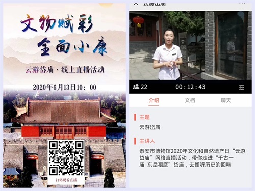 本次活动还首次尝试开展了“云游岱庙”网络直播活动。借助国内有着20多年在技术、产品与服务创新都具有较强实力的信息化企业——超星公司的技术支持,通过线上形式,在博物馆金牌讲解员的带领下进入“千古一庙东岳祖庭”岱庙,沿经典游览线路去了解古老庙宇内的建筑、碑刻、古树,感受传统文化的博大精深和无穷魅力。游客不仅可以在北门显示屏直接观看,还可以通过扫描二维码手机观看直播、参与互动,满足了不同观众特别是年轻群体的需求。