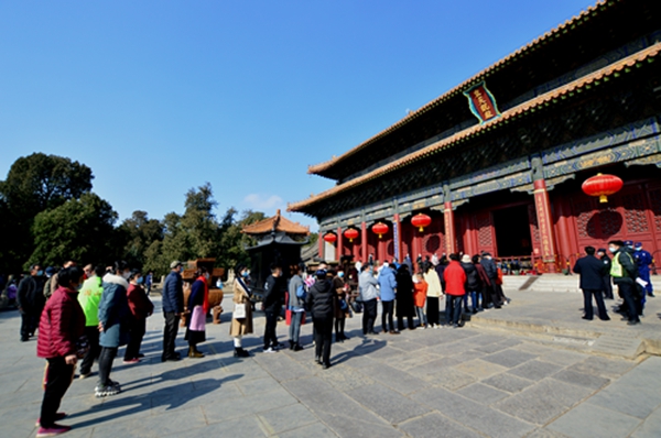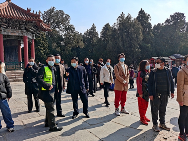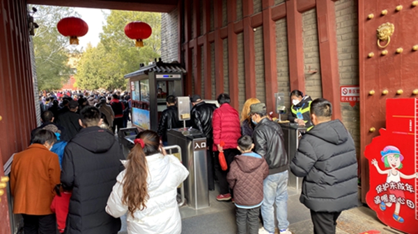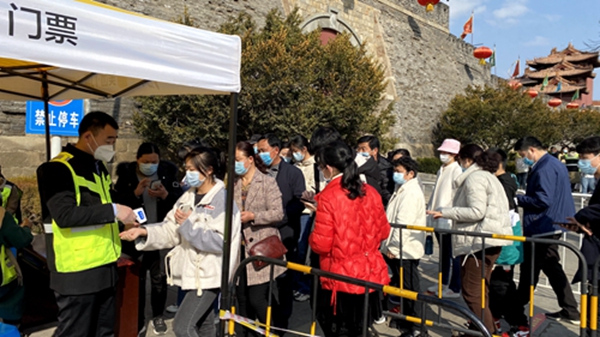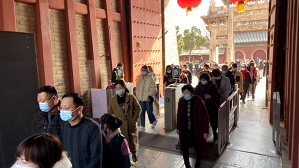 为做好春节期间的疫情防控工作,博物馆严格按照泰山景区疫情防控工作要求,全面落实疫情防控措施。今年岱庙景区首次实行“限量、预约、错峰”游览和南门进、北门出单向参观方式,岱庙景区执行最大承载量的75%,每日游客接待量不超过2.25万人,每两小时为一时段,每个时段预约上限为5625人,错过预约时段须重新预约。针对新要求,博物馆提前谋划,统筹安排,在官网和微信上发布公告,提醒游客朋友须网上预约后才能入园参观。为重点把好健康查验关、体温监测关、应急处置关等关口,对二线职工进行美团门票APP扫码预约程序及防疫检疫工作培训,分为防疫检测、扫码指导、检验码三个小组全部充实到一线岗位。同时储备了充足的防护口罩、酒精等防疫物资,安排专人多次对院内环境进行消杀。在南北门及天贶殿前等重点部位增设护栏,引导游客有序参观。与市公安局、消防救援支队联合行动,增强安保力量,全力维护岱庙景区安全稳定,保障游客在岱庙度过一个平安、祥和、欢乐的假期。