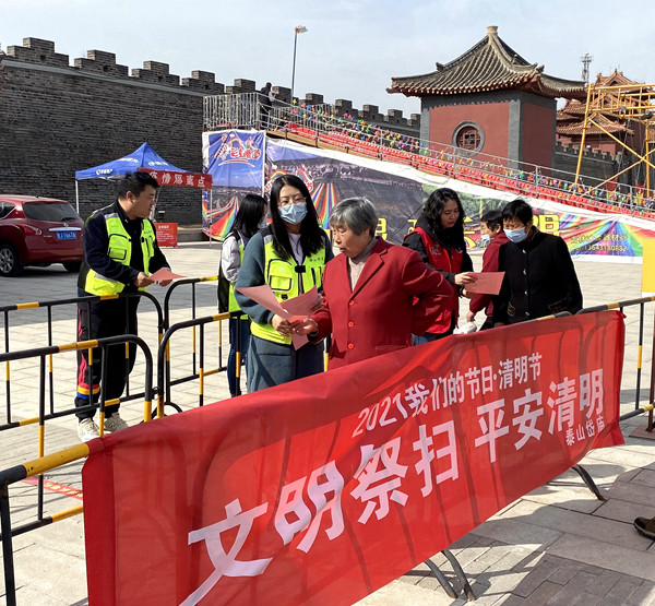为加大活动宣传力度和宣传效果,博物馆利用岱庙官方微信发布了“清明节安全文明祭扫倡议书“,在南北门显示屏、游人中心循环播放宣传海报,印制文明出行和文明祭扫倡议书,组织部分党员和志愿者在岱庙南北入口处进行发放,通过与市民、游客交流互动,现场咨询解答,倡议广大游客和市民采用人文祭扫、网上祭祀、鲜花寄哀思等文明、环保、健康、安全的方式表达思念之情,引导大家在祭扫活动中移风易俗、树立文明健康的祭扫新风。同时宣传普及文明出行常识,传播文明出行理念,提高大家自觉遵守文明出行公约意识,营造了一个平安出行、文明和谐的旅游环境。