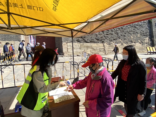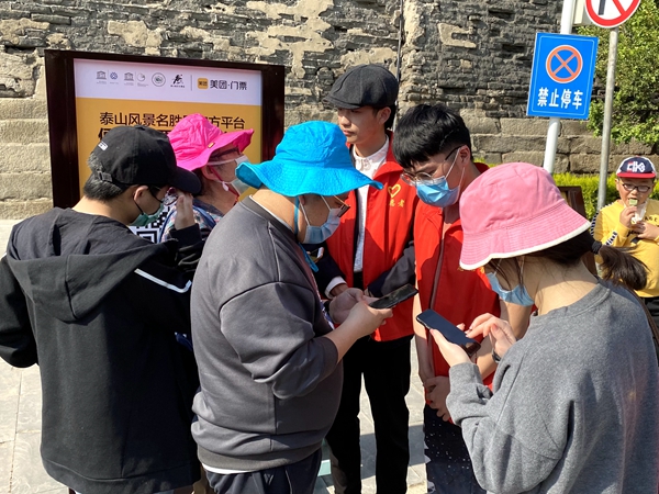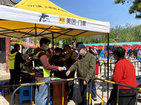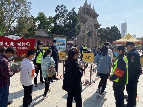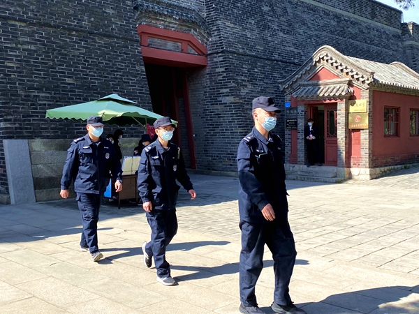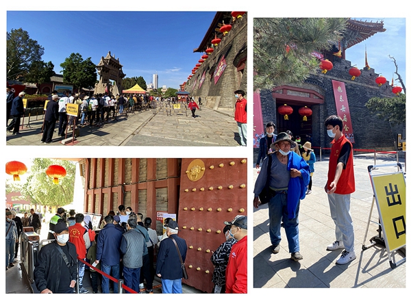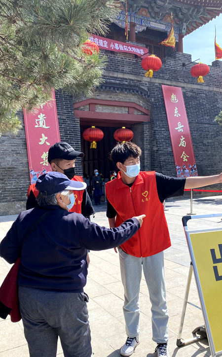 博物馆全体职工全部充实一线,根据客流高峰和重点区域进行科学配置,增强志愿服务力量和保卫巡查力度,全力保障节日各项工作。在南北门、天贶殿等重点区域设置护栏,采取出入口分离措施,引导游客有序游览;严格落实疫情防控措施,重点把好健康查验关、体温监测关、应急处置关等关口;志愿者耐心细致指导游客扫码购票,解答游客咨询;督促庙会业户明码标价、优质服务,维护好旅游秩序;增加岱庙景区院内、公共卫生间保洁力量,确保垃圾日产日清;与公安、应急救援等部门联合,加强院内巡查,确保游客安全。