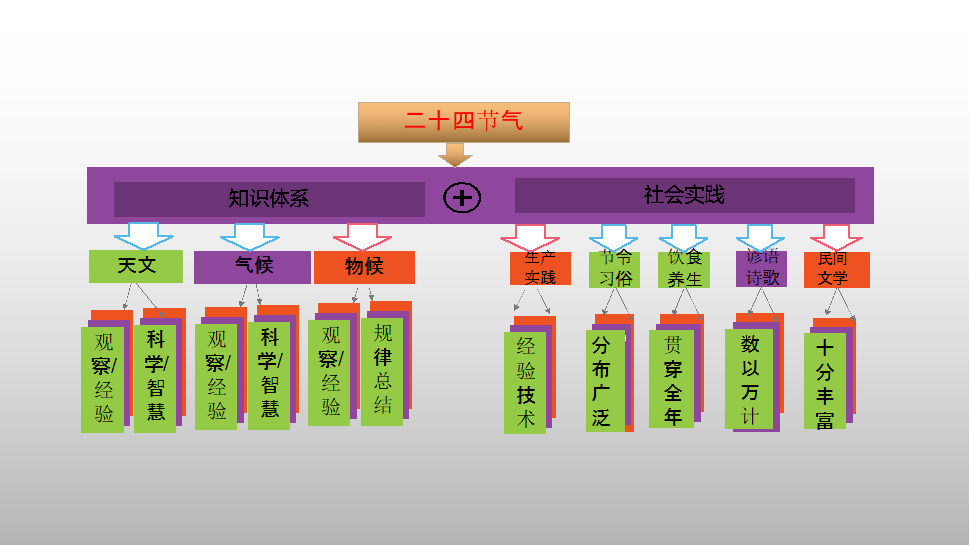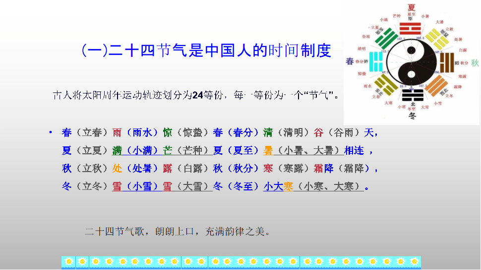 中国先民根据太阳周年运动轨迹划分为24等分,每一个等份为一个“节气”,统称“二十四节气”。节气这两个字,其实反映了中国古人的认知中,气的升降和聚散的运动,以及由它所推动和调控的宇宙万物的发生、发展和变化。《庄子》就提出了:“通天下一气耳。”《史记》中也认为:“气始于冬至,周而复始。”并且,一气分为阴阳,阴阳二气彼此消涨,幻化出天地万物和丰富多彩的世界。