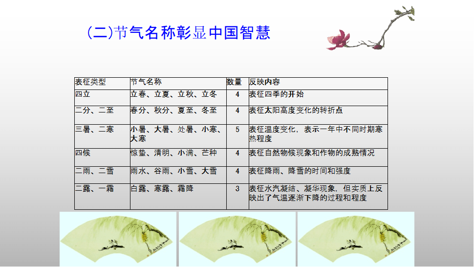 二十四节气蕴含着中国人天地人和的生态智慧。二十四节气的名称表征了季节的变化、太阳运动的轨迹、气温变化、动植物物候降雨降雪水汽凝结凝华现象。而且还进一步细分出了七十二候,在七十二候中有包括四十个反映动物迁徙鸣叫的候应,有十三个反映植物开花的候应,有六个反映水、冰、雨、露、泉的候应,十三个反映天、地、气、风、雷、电、虹的候应。从对大自然的观察中,找到变化的规律,这是中国先民认识自然的基本依据,也是人们顺应自然的重要指征。因此二十四节气蕴含着天人合一、因时制宜、因地制宜、循环发展的哲学思想和科学理念,也彰显了中国文化天地人和的生态智慧。