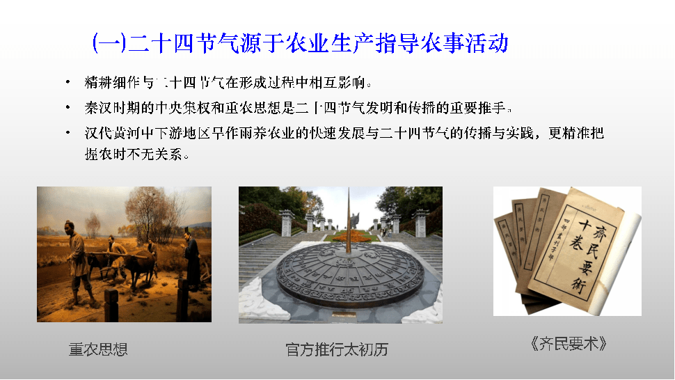 我们的先民在汉武帝时期,于公元前104年把二十四节气纳入了太初历,开启了二十四节气的全面推广应用阶段。在应用过程中,二十四节气极大地丰富了文化内涵。它对天文的观测、对气候、物候的观测,以及生产实践的指导、节令习俗、饮食养生、谚语歌谣、民间文学等等,都赋予了非常丰富的内涵。围绕二十四节气每一个主要节点逐渐形成众多节气的信仰、禁忌、仪式、饮食、养生这样的习俗,发展成为蔚为大观的节气文化。