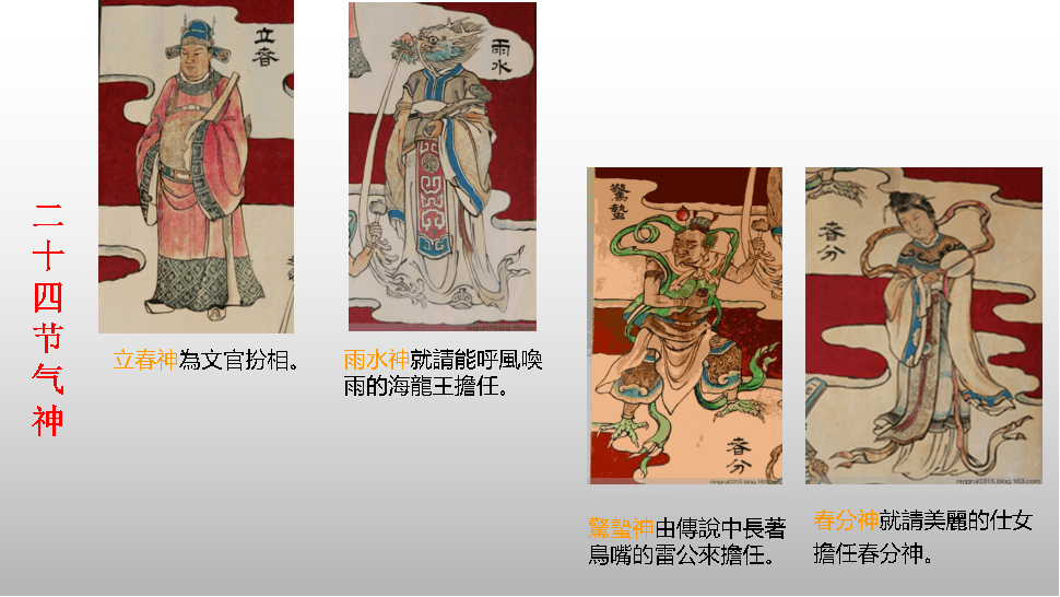 在这些节气的绘画表达中,每个节气神都有一个典型代表性的特征,清明用七爷来代表。谷雨就是左手拿着缽,以缽接雨水来滋润播种的百谷。立夏是文官的服饰一半是文官,一半是武官。芒种是拿的稻禾,夏至是拿着铁树叶,还拿着小火苗,小暑是拿着火盆,大暑是大火盆,简明扼要反映了各个节气的特征。
