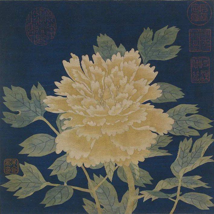 说起缂丝牡丹,就不得不提南宋缂丝名手朱克柔的作品,也就是面前的这幅佳作。让我们一起来欣赏一下吧!整幅作品以蓝色为底,其上盛开一朵由黄绿色茎叶衬托而出的牡丹,富丽娇艳,惹人注目。牡丹花朵饱满端庄,四周叶片扬招于阳光下,叶片上斑驳错落留有花朵的影子,显得花色更加明媚,硕大而立体;牡丹的花叶也是千姿百态,如娇娥之手,捧托呵护。左下角还缂有“朱克柔印”。整幅画面均以长短戗等多种缂织技法织就,牡丹花瓣和花叶用同一色系,却深浅不同的颜色相互穿插缂织,显现出自然晕色的效果,宛如一朵鲜活的牡丹坐拥无限风光。
