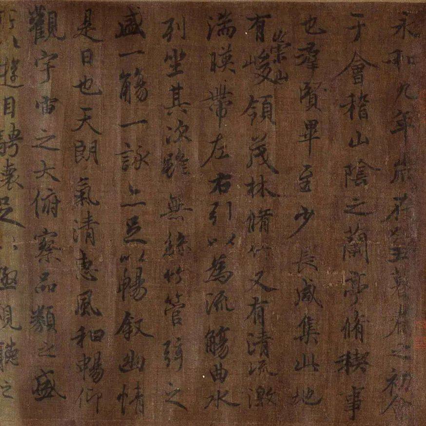 我们面前的这件作品是兰亭序的宋代拓本。提到兰亭序,想必大家并不陌生,它是东晋书圣王羲之于会稽山下以文会友,畅饮美酒后写出的“天下第一行书”。