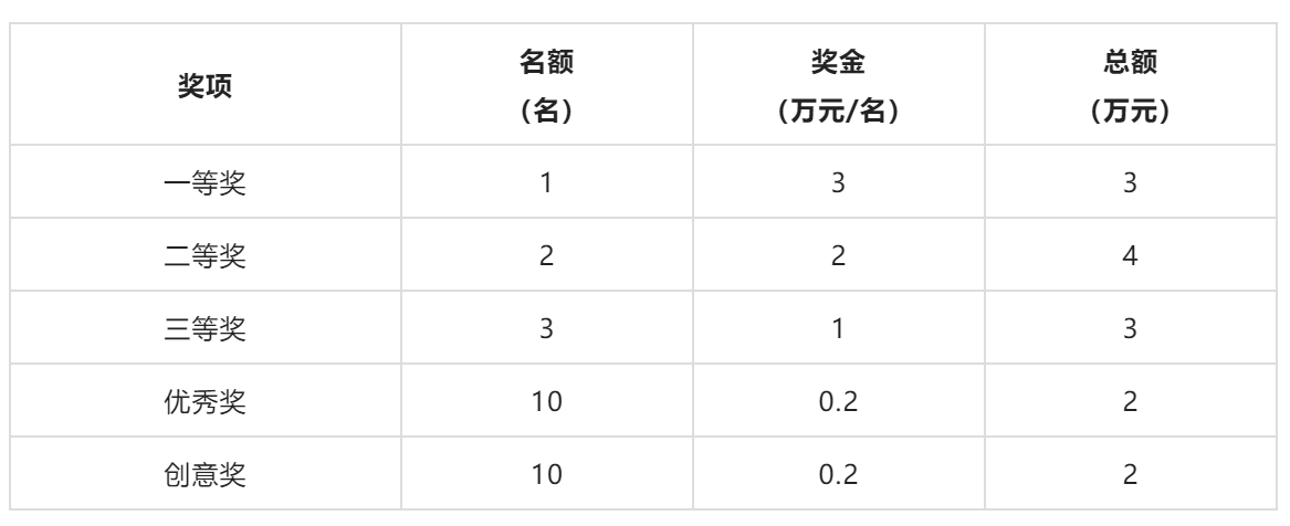本届大赛设一等奖1名、二等奖2名、三等奖3名、优秀奖10名、创意奖10名,具体如下(赛事所有奖金均为税前奖金):