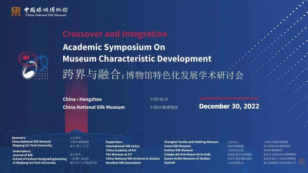 为贯彻落实全省文物工作会议精神,积极建设世界一流博物馆,实施“国丝国际伙伴计划”,掌握国际博物馆界最新发展动态,推动博物馆特色化和高质量发展,以博物馆发展融入中国丝绸时尚产业并为产业发展赋能。2022年12月30日,由中国丝绸博物馆发起策划的“跨界与融合:博物馆特色化发展学术研讨会”(线上)成功召开。