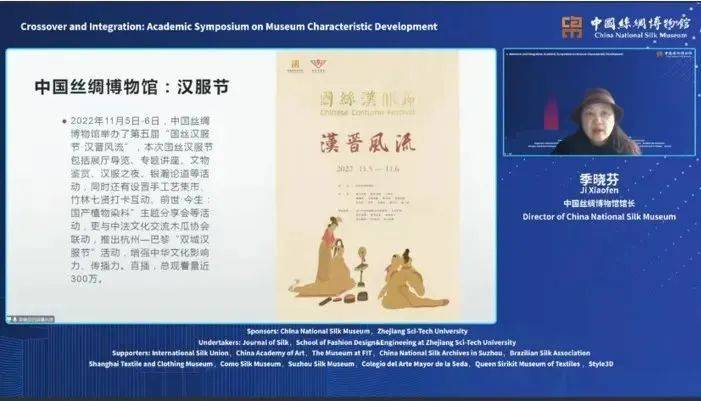 中国丝绸博物馆馆长季晓芬教授分享了《跨界与融合:纺织服饰类博物馆时尚化发展之路》。季馆长从博物馆新定义的解读入手,强调了博物馆以人为本,以及在城市文化多样性、包容性、社会可持续发展与教育等领域的使命。报告展示了国外各大纺织服饰类博物馆的发展特色,使参会人员厘清了时尚艺术博物馆与都市发展的关系。同时,季馆长围绕“跨界与融合”这一主题,介绍了中国丝绸博物馆在汉服节、时尚回顾展、观众互动等时尚活动进行的一系列突破,推动丝绸博物馆走时尚化发展之路。通过为城市赋能、为产业赋能,创造面向未来的可持续的时尚生态圈,为各国博物馆的转型与变革带来新的启示。