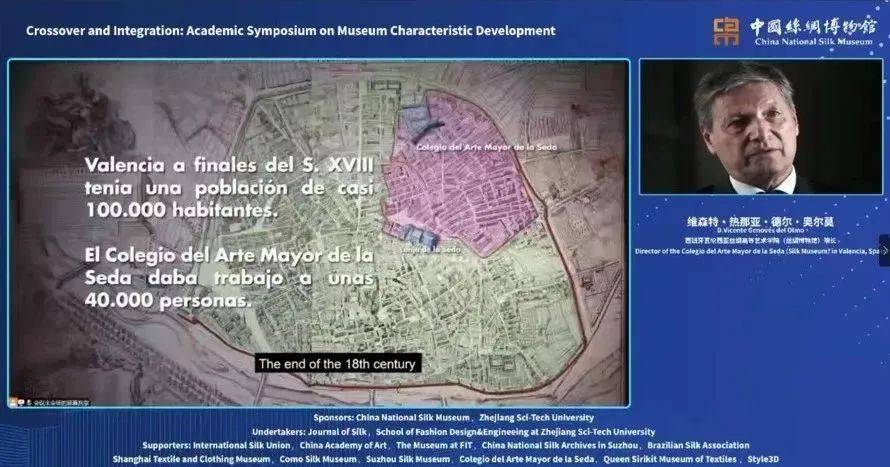 西班牙瓦伦西亚丝绸高等艺术学院(丝绸博物馆)院长D.Vicente Genovés del Olmo(维森特·热那亚·德尔·奥尔莫)带来了《瓦伦西亚丝绸博物馆与丝织业的辉煌历史与现代传承》。他认为,瓦伦西亚丝绸博物馆可以以实体的建筑为三维展示空间,以瓦伦西亚丝绸品质为抽象记忆锚点,结合新时代新业态,跨时空展现行业产业的历史积淀与活力,从而有效履行博物馆的职能,为其他博物馆的展陈策略、可持续发展、变革与转化等方面提供了重要的参考价值。