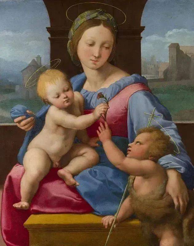 作为“文艺复兴三杰”之一,拉斐尔就是浪漫与典雅的化身。理解欧洲艺术的故事,也必然不可忽略拉斐尔。他留下许多艺术史中被奉为典范的圣母形象,本作是小而精美的一件。虽然是宗教题材,但并不会令人感到疏离。拉斐尔对圣母环绕的怀抱、赤裸的孩子柔软凹陷的皮肤、结实的幼儿向圣母伸出的手臂进行了触觉上亲切的精妙演绎。圣母子之间的情感互动也复杂又感人。他试图通过几何结构图来呈现出绝对和谐的视觉效果,使圣像与背景完美地结合在一起,营造出一种深沉的静谧感。拉斐尔用温柔而理想的画作,抚慰着人们敏感脆弱的心灵。