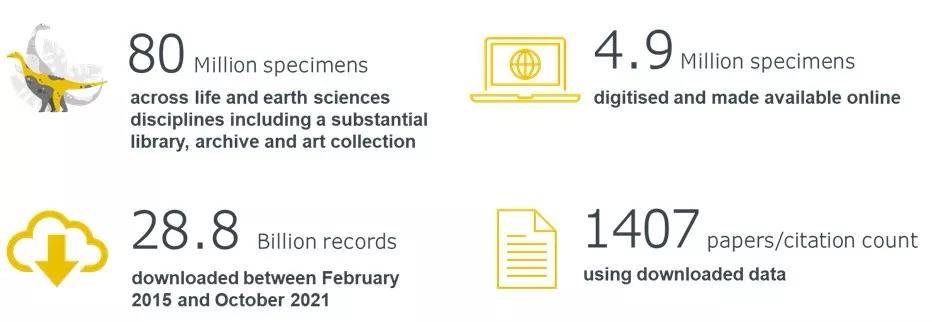为了探索藏品数字化的经济和社会价值,英国自然历史博物馆与咨询公司经济学前沿(Frontier Economics Ltd.)合作。目前,博物馆在该项目上取得了一些进展,但还需要一些额外的投资。自2015年以来,英国自然历史博物馆通过数据门户网站在线提供了493万份标本。数字化是创建和共享自然历史博物馆标本的相关数据的一种过程,所有相关信息都会被添加到在线数据库中。