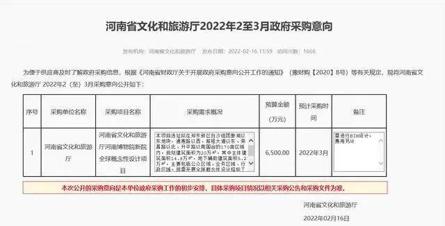 2月17日,大象新闻记者从河南省政府采购网上看到,河南省文化和旅游厅发布2022年2至3月政府采购意向。其中,开展河南博物院新院全球概念性设计招标工作,预算金额6500万,预计采购时间2022年3月。