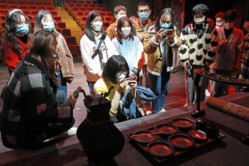 为增进公众互动,试运营首日,湖南省博物馆邀请8位幸运观众来到现场,跟随《一念·辛追梦》复排导演赵旭一起走进幕后,近距离观赏展出文物道具,共同探秘“裸眼3D”的黑科技视效制作。活动现场,赵旭逐一向幸运观众展示漆几、莞席、云鸟纹漆钫、龙纹漆竹勺、云纹漆案、漆盘、彩绘漆卮(无盖)、耳杯等多件文物道具。